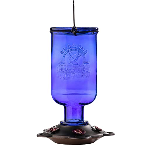 More Birds Elixir Hummingbird Feeder, Blue Vintage Glass Medicine Bottle Hummingbird Feeder for Outdoors, 5 Feeding Stations, 13 Ounces