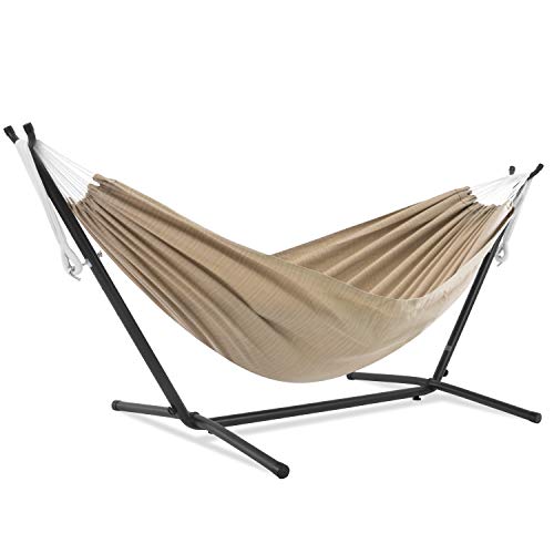 Vivere Double Sunbrella® Hammock with Space Saving Steel Stand, Sand (450 lb Capacity - Premium Carry Bag Included)