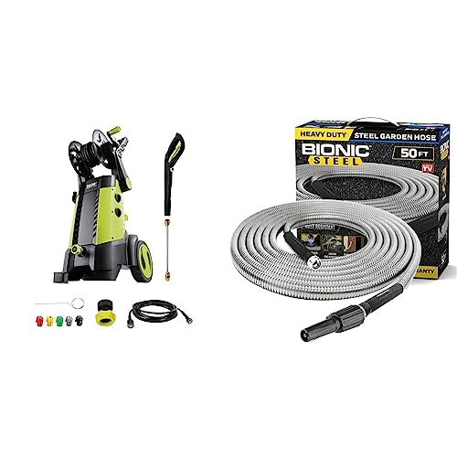 Sun Joe SPX3001 2030 PSI 1.76 GPM 14.5 AMP Electric Pressure Washer, Green & Bionic Steel 50 Foot Garden Hose 304 Stainless Steel Metal Water Hose