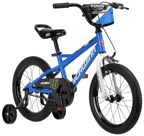 Schwinn Koen & Elm Toddler and Kids Bike, For Girls and Boys, 14-Inch Wheels, BMX Style, With Saddle Handle, Training Wheels Included, Chain Guard, and Number Plate, Blue