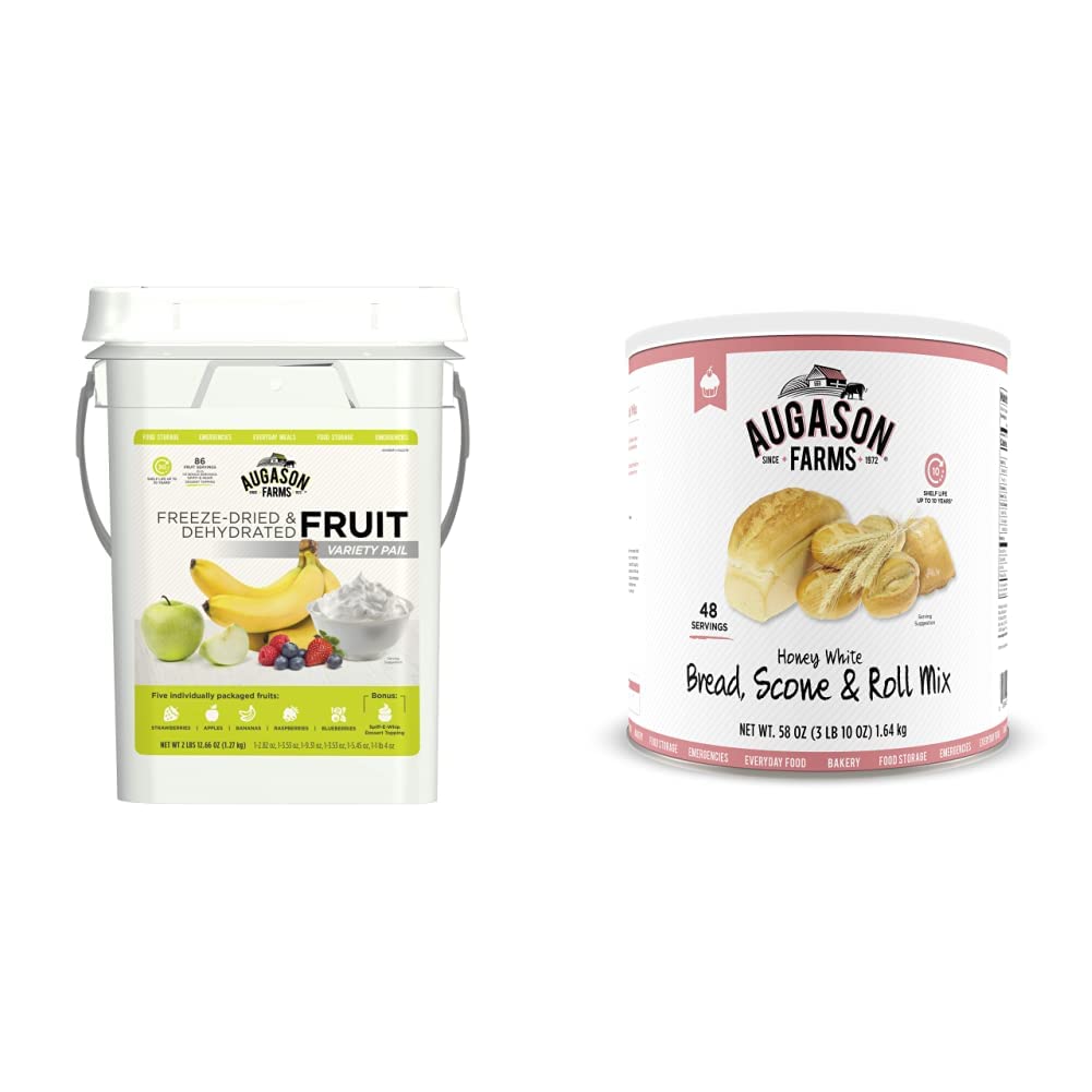 Augason Farms Dehydrated and Freeze-Dried Fruit Variety Pail, 25-Year Shelf Life, Emergency Food Supply, Camping Food & Honey White Bread Scone & Roll Mix Emergency Food Storage #10 Can