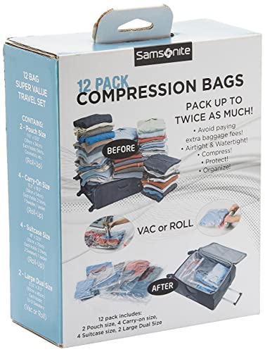 Samsonite Compression Packing Bags, Plastic, Clear, 12-Piece Kit (2-Pouch/4-Carry-On/4-Large/2-X-Large