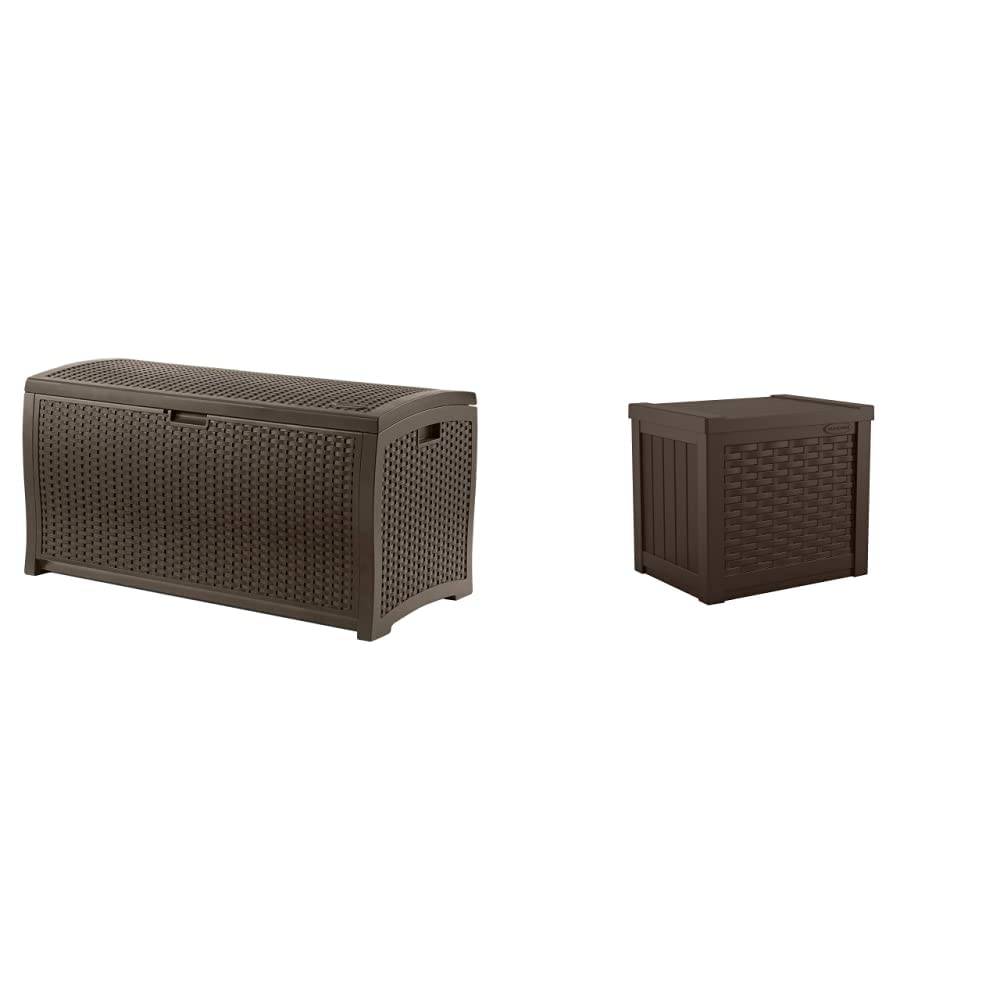 Suncast 99 Gallon Resin Wicker Patio Outdoor Storage Container Mocha & 22-Gallon Small Deck Box - Lightweight Resin Indoor/Outdoor Storage Container and Seat - Java Brown