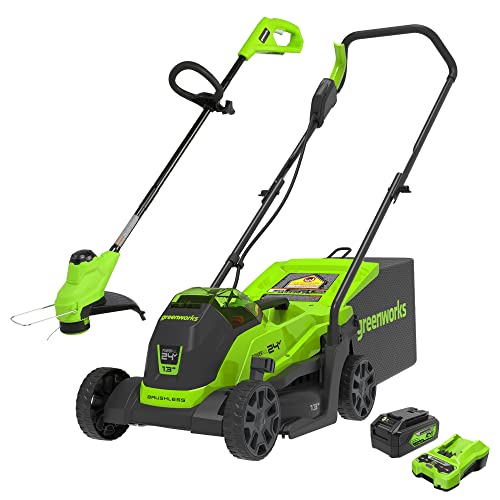 Greenworks 24V 13" Brushless Lawn Mower, String Trimmer, 4.0Ah USB Battery and Charger Included