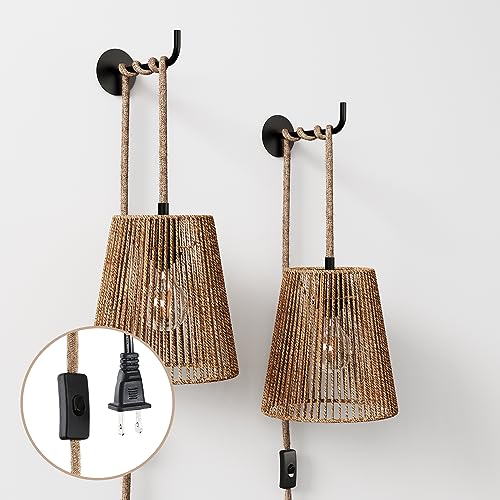 Nathan James Atlas 1-Light Plug-in Wall Lamp, Bedside Reading Wall Sconce with Seagrass Shade and Woven Rope Accent, Set of 2
