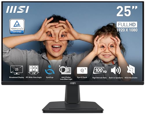 MSI Pro MP251 Computer Monitor, 24.5", 1920 x 1080 (FHD), IPS, 100Hz, VESA Mountable, Speaker, TUV Certified Eyesight Protection, Anti-Glare Display, Less Blue Light,1ms, HDMI, VGA, Tilt, Black