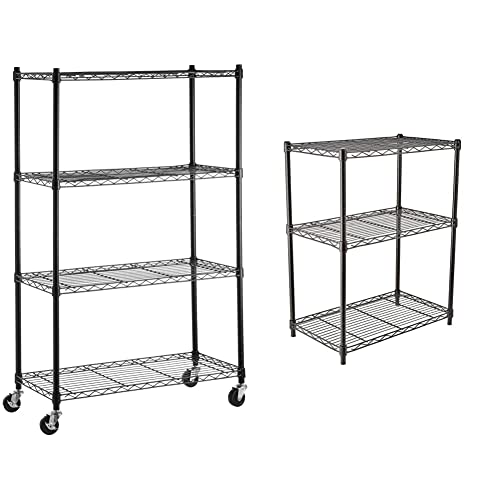 Amazon Basics 4-Shelf Shelving Storage Unit on 3'' Wheel Casters, Black (36L x 14W x 57.75H) & 3-Shelf Adjustable, Heavy Duty Storage Shelving Unit (250 lbs), Black (23.3L x 13.4W x 30H)