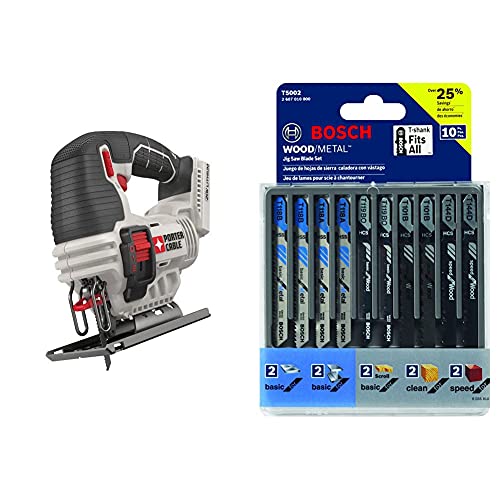 PORTER-CABLE 20V MAX* Jig Saw, Tool Only (PCC650B) & Bosch T-Shank Multi-Purpose Jigsaw Blades, 10 Piece, Assorted, Jig Saw Blade Set for Cutting Wood and Metal (T5002)