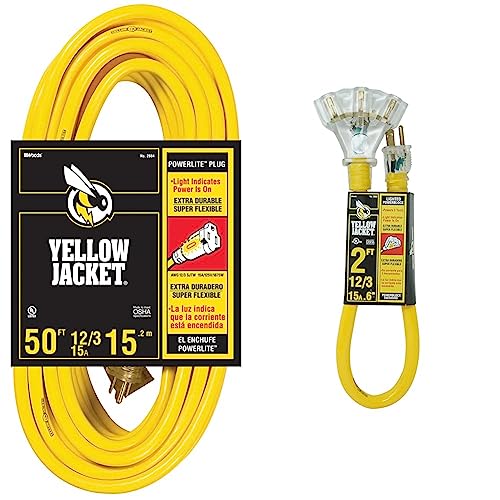 Yellow Jacket 2884 12/3 Heavy-Duty 15-Amp SJTW Contractor Extension Cord, 50-Feet & 2882 12/3 Heavy Duty 15-Amp, 125 Volts 1875 Watts, Premium SJTW Contractor Grade 3 Outlet Extension Cord, 2-Feet