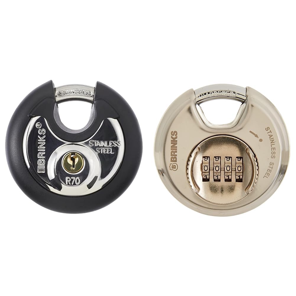 BRINKS - 70mm Commercial Stainless Steel Keyed Discus Padlock - Stainless Steel Body with Stainless Steel Shackle & 173-80051 Stainless Steel Resettable Combination Discus Padlock, 80Mm, Silver