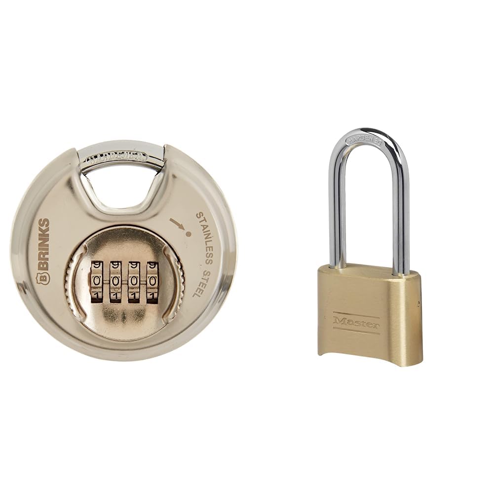 BRINKS 173-80051 Stainless Steel Resettable Combination Discus Padlock, 80Mm, Silver & Master Lock Set Your Own Combination Padlock with Extra Long Shackle, Brass Finish