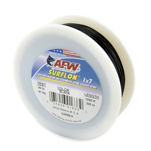 American Fishing Wire Surflon, Nylon Coated 1x7 Stainless Steel Leader Wire, 90 lb Test, 036" Diameter, Black, 1000 ft