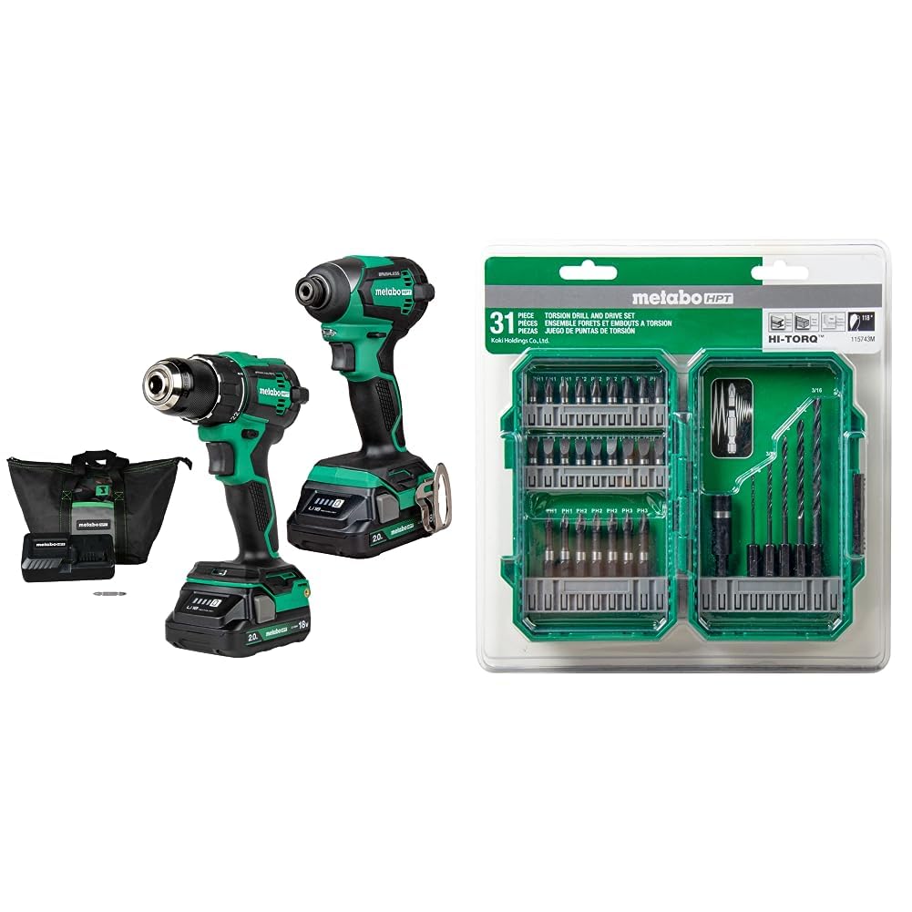 Bundle of Metabo HPT 18V MultiVolt™ Cordless Brushless Driver Drill & Impact Driver Combo Kit | KC18DEXQB + Metabo HPT Drill and Drive Bit Set | 31 Piece | 115743M