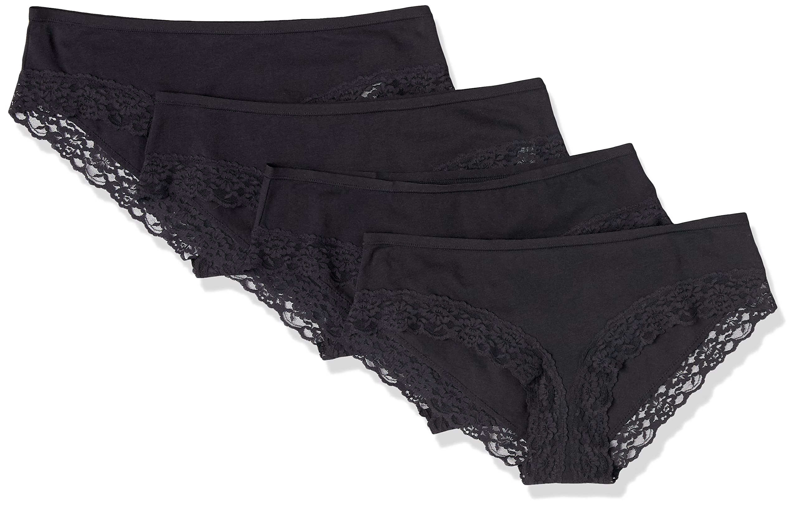 Amazon Essentials Women's Cotton and Lace Hipster Underwear, Pack of 4, Black, Medium