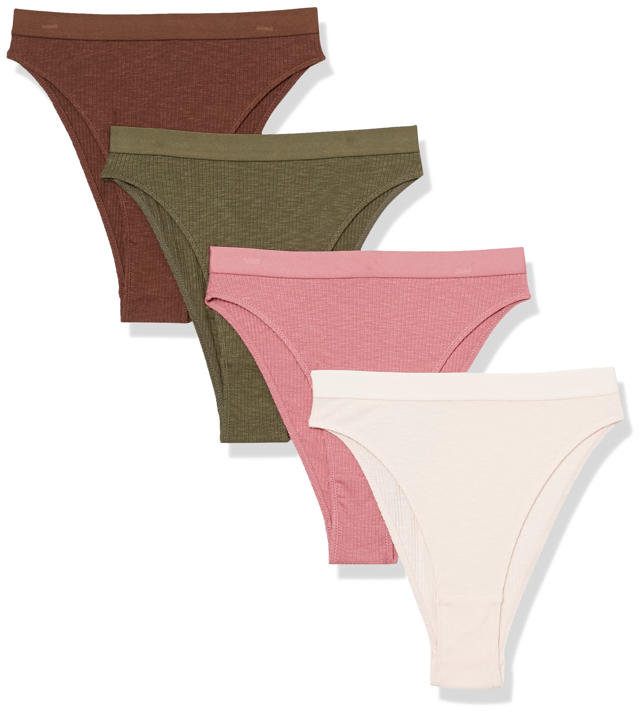 Amazon Essentials Women's Ribbed High Waist Tanga Brief, Pack of 4, Brown/Pale Pink/Green, Medium