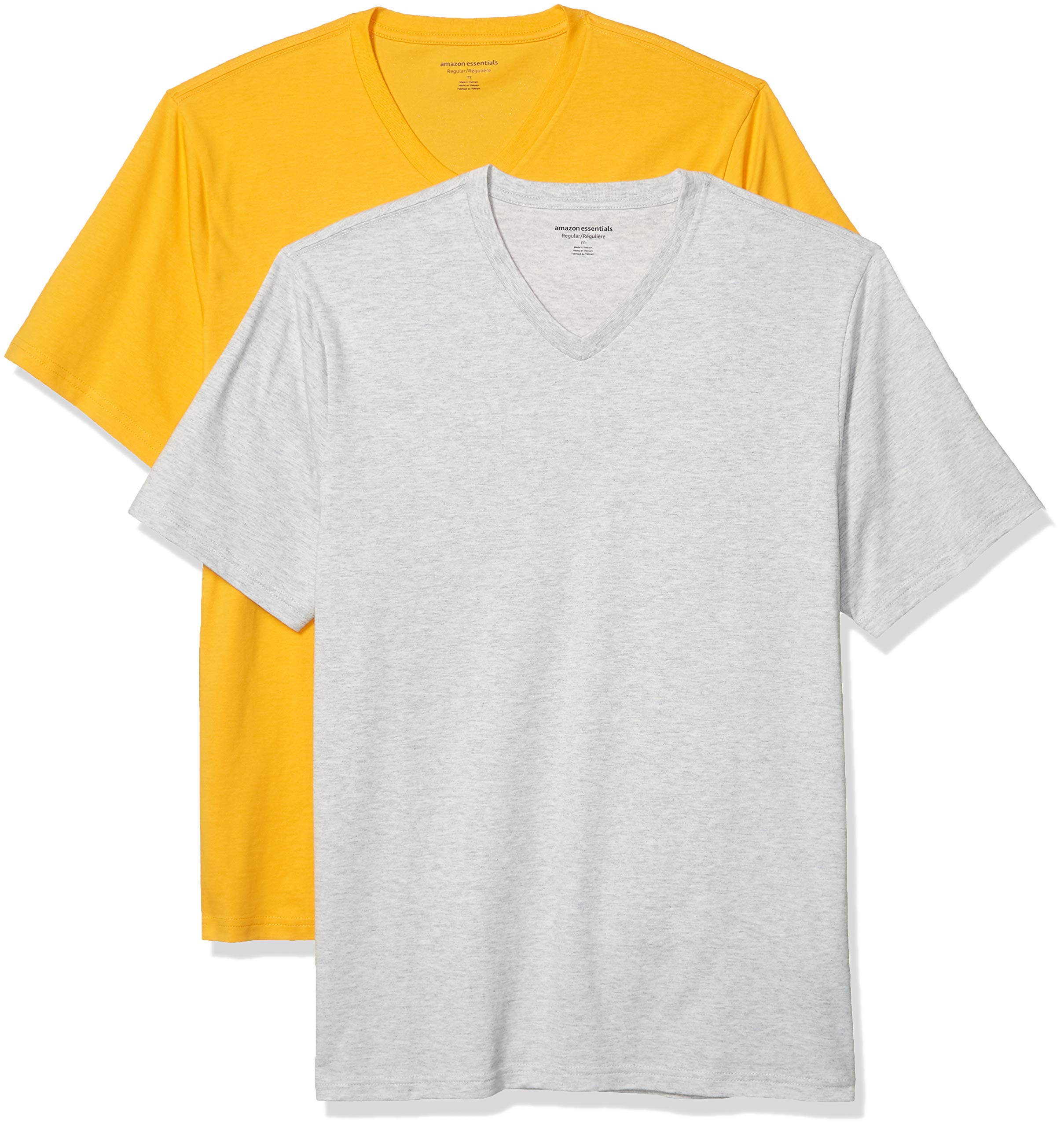 Amazon Essentials Men's Regular-Fit Short-Sleeve V-Neck T-Shirt, Pack of 2, Light Grey Heather/Apricot Orange, X-Small