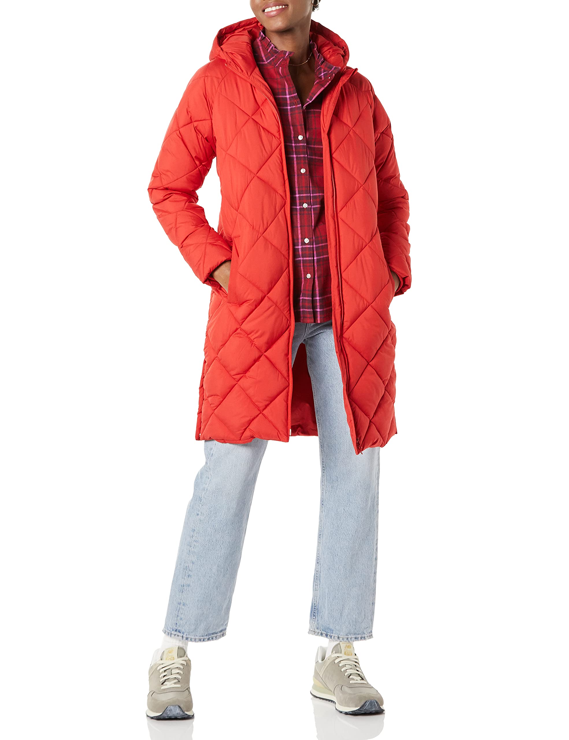 Amazon Essentials Women's Heavyweight Diamond Quilted Knee Length Puffer Coat, Red, Medium
