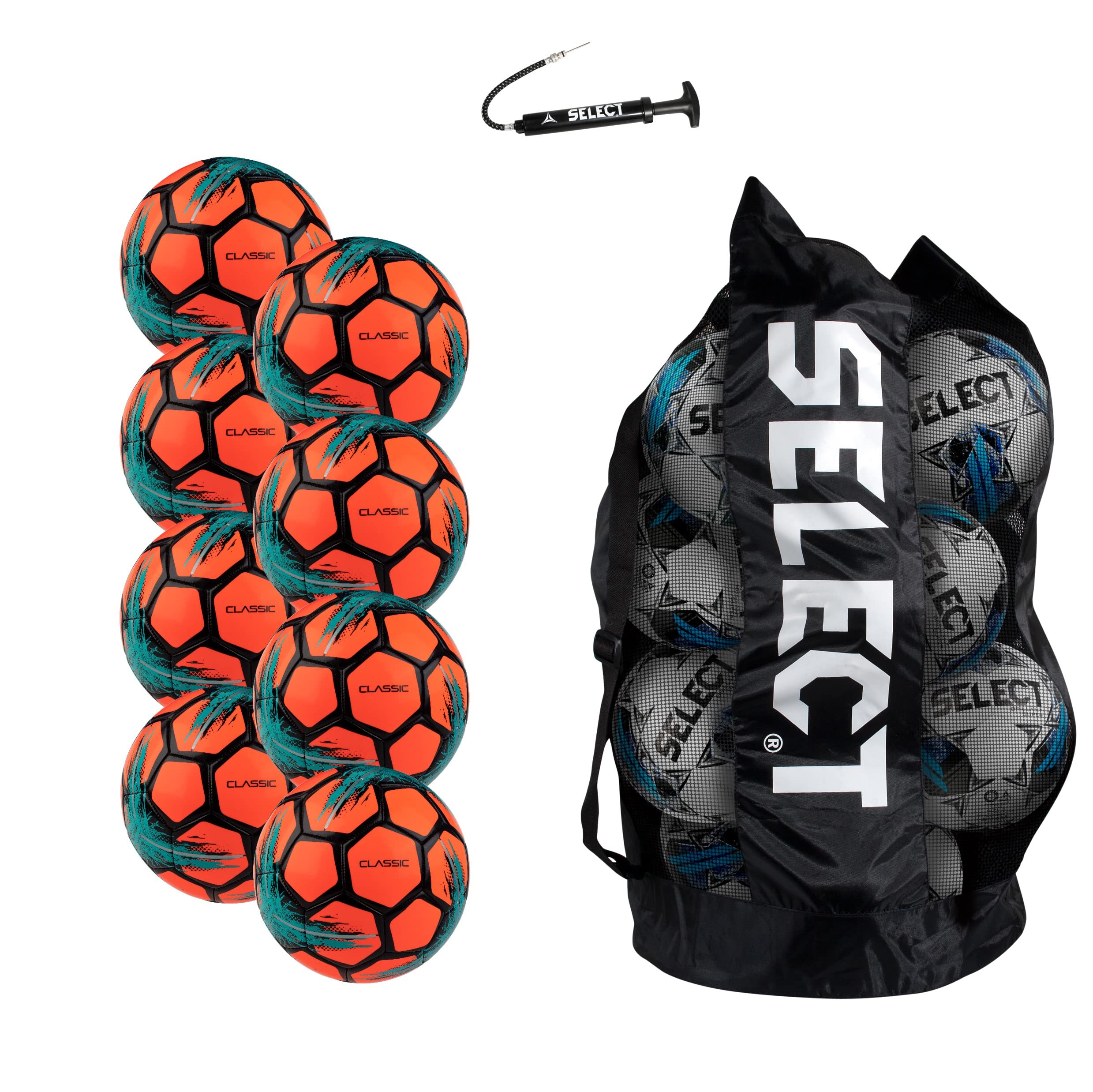 Select Classic V21 Soccer Ball, 8-Ball Pack with Duffle Ball Bag and Hand Pump, Orange, Size 5