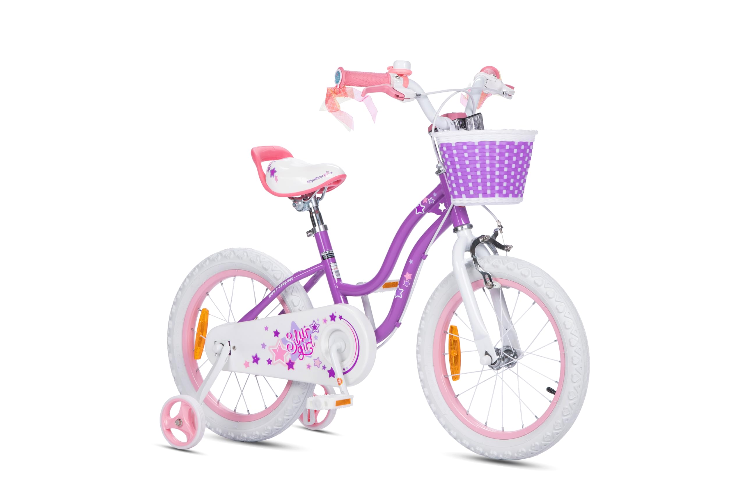๐ SPECIFICALLY FOR GIRLS. Royalbaby girls bike has a low stance and delicate curve frame, which is easy for kids to hop on. Cute bike in lovely colors and details, dual brakes (pedal and hand), detachable height-adjustable wider training wheels for excellent steadiness, a bell, and a basket for her dolls. It's a great first bike with all the bells and whistles a child will need to learn and get comfortable with biking.