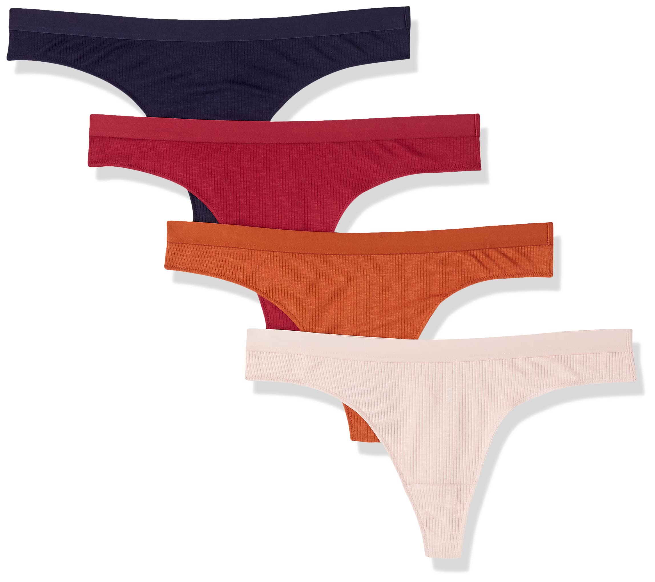 Amazon Essentials Women's Ribbed Cotton Thong Underwear, Pack of 4, Brown/Light Beige/Navy/Red, Large