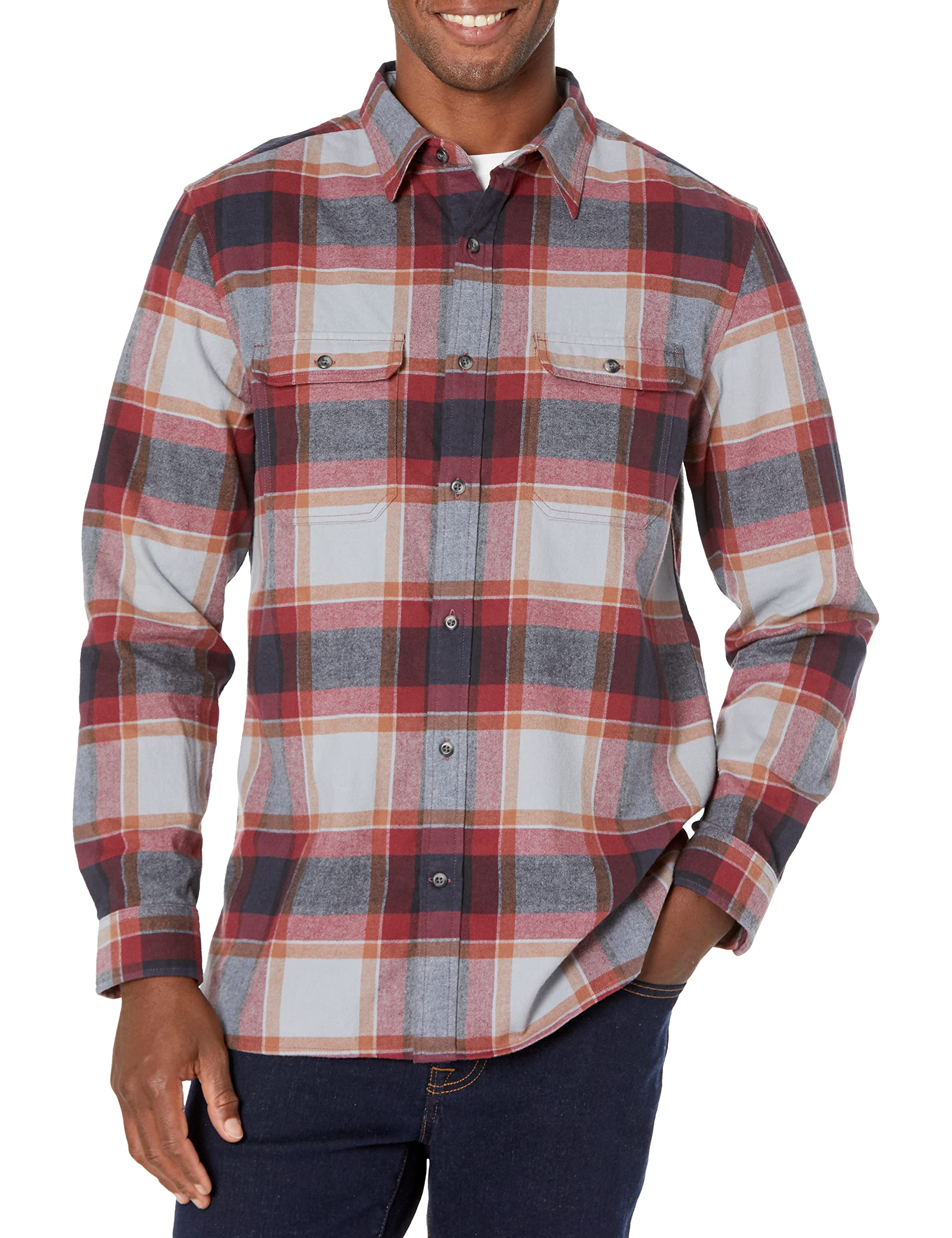 Amazon Aware Men's Regular-Fit Long-Sleeve Flannel Shirt, Grey Red Plaid, X-Small