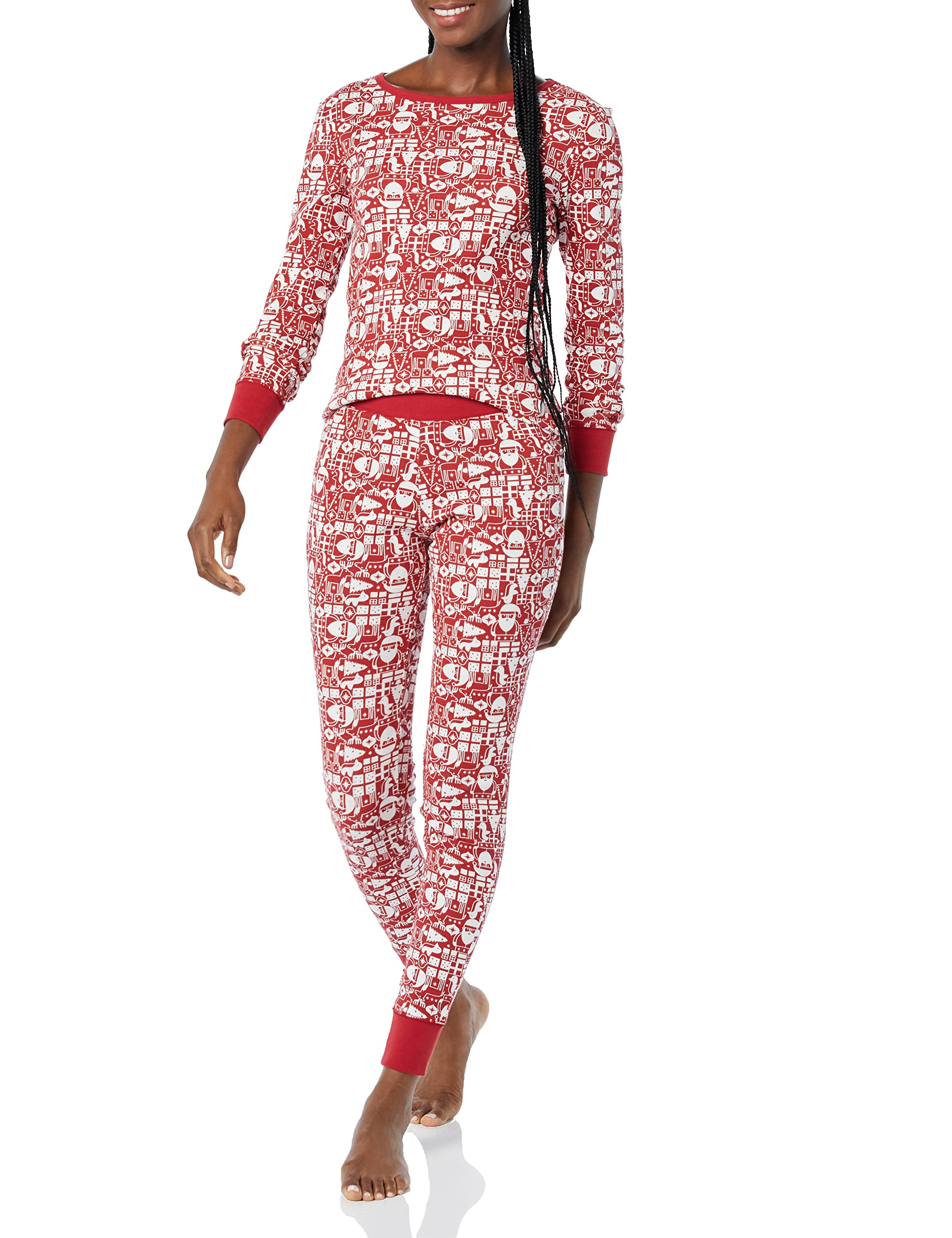 Amazon Essentials Women's Snug-Fit Cotton Pajama Set (Available in Plus Size), Red Mono Santa, 3X