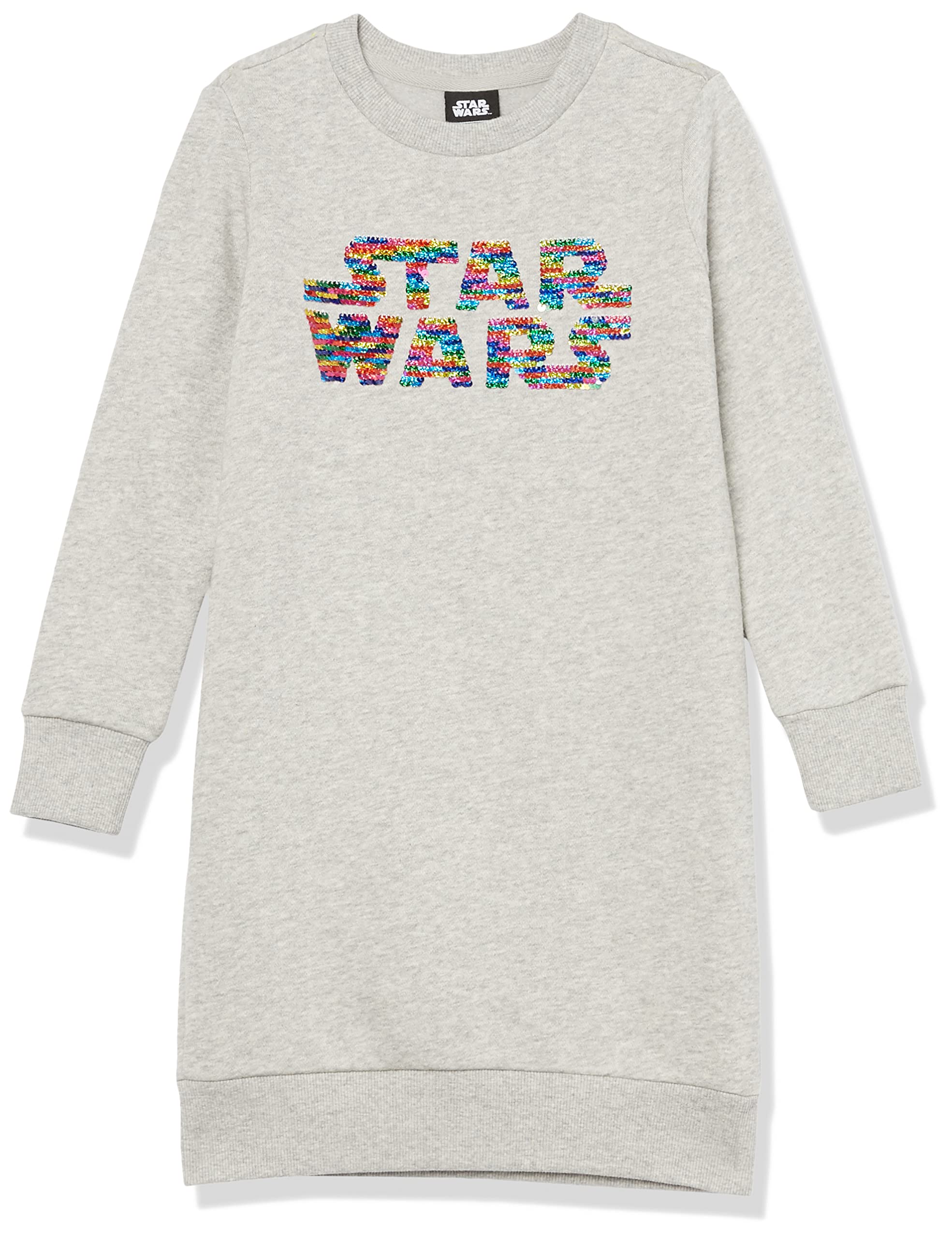 Amazon Essentials Disney | Marvel | Star Wars | Frozen Girls' French Terry Long-Sleeve Dresses (Previously Spotted Zebra), Star Wars/Logo/Sequined, Medium