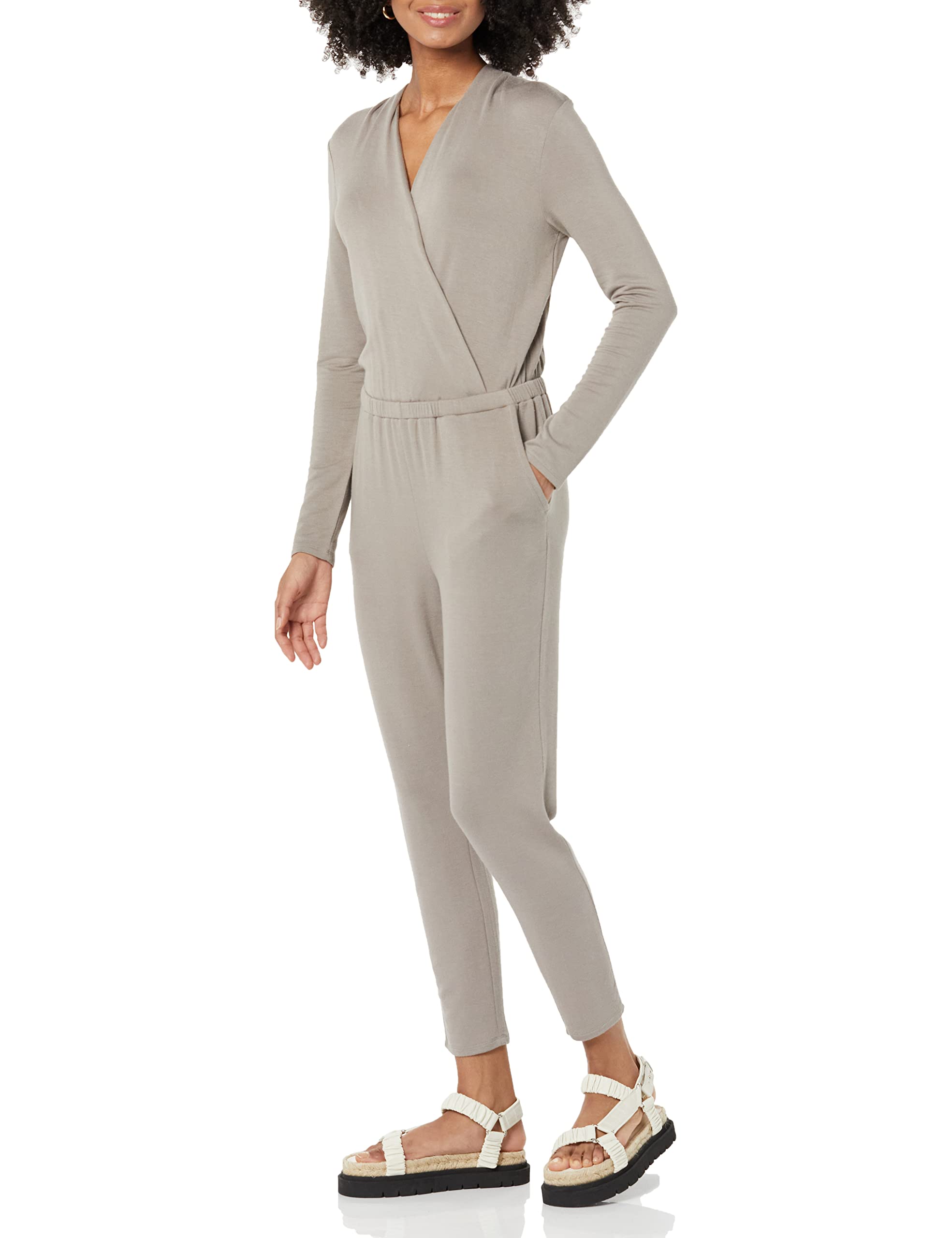 Amazon Essentials Women's Supersoft Terry Long-Sleeve V-Neck Wrap Jumpsuit (Previously Daily Ritual), Smokey Grey, Medium