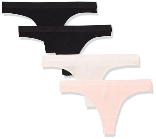 Amazon Essentials Women's Ribbed Cotton Thong Underwear, Pack of 4, Black/Bright White/Pale Pink, Medium