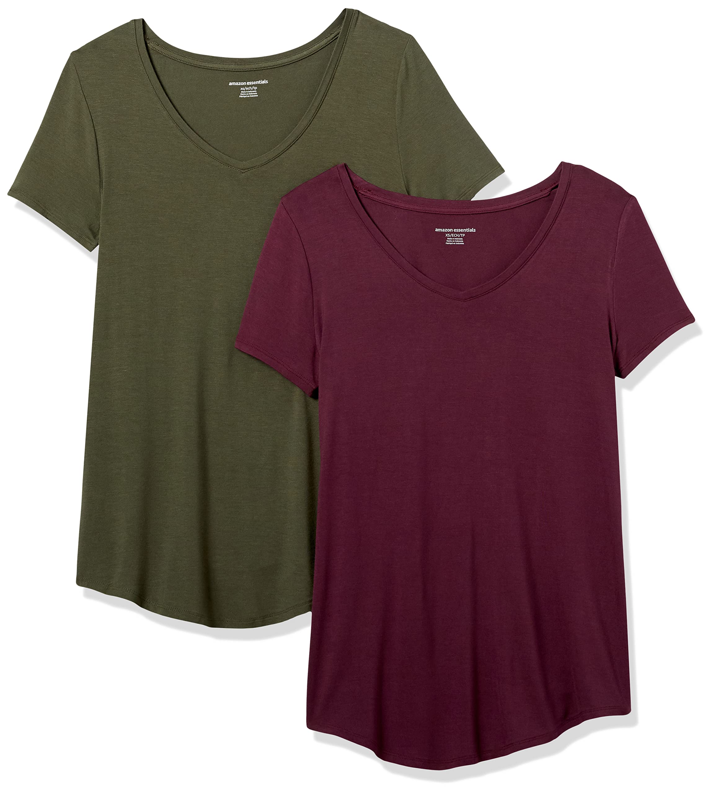 Amazon Essentials Women's Relaxed-Fit Short-Sleeve V-Neck Tunic (Available in Plus Size), Pack of 2, Olive/Burgundy, X-Small