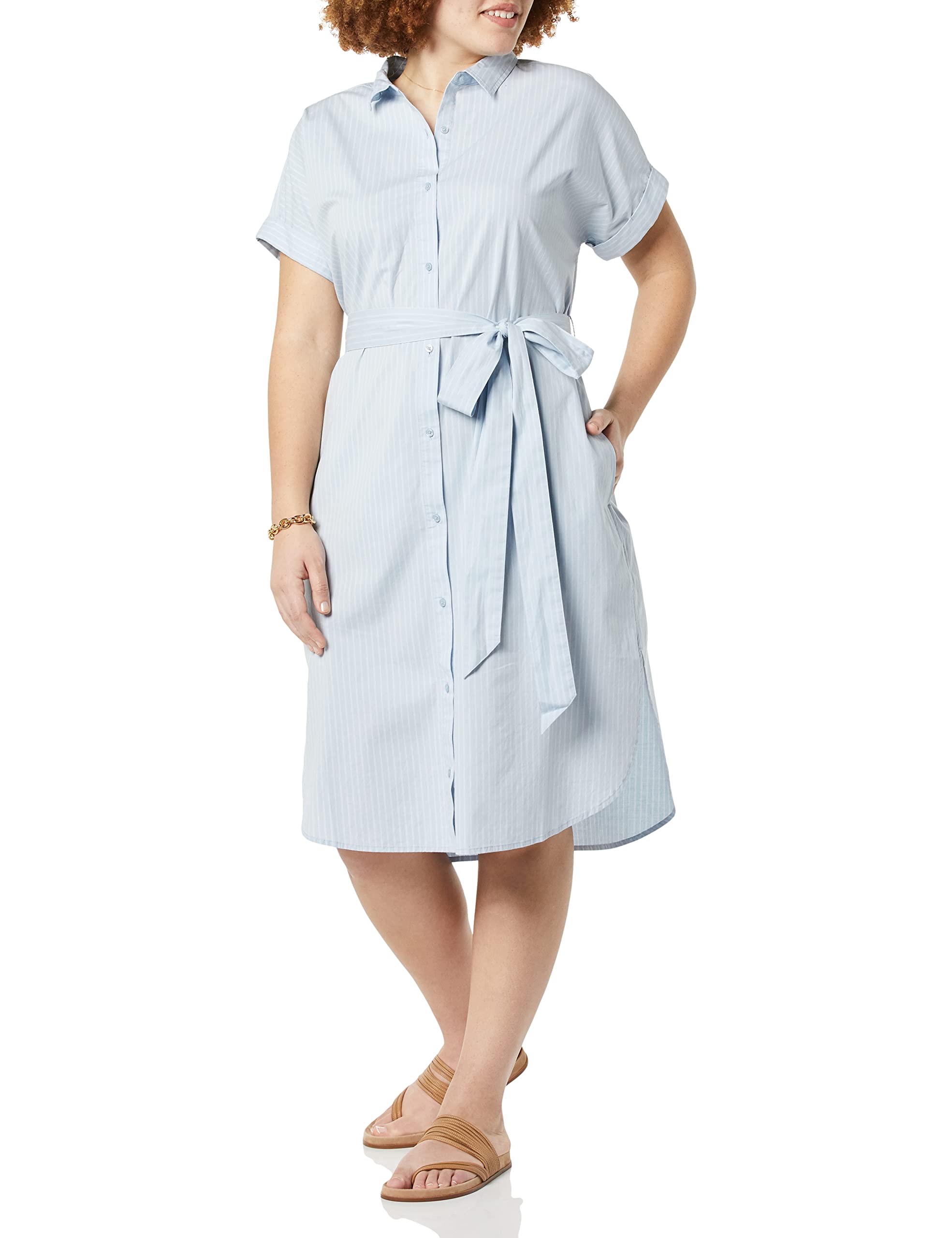 Amazon Essentials Women's Relaxed Fit Short Sleeve Button Front Belted Shirt Dress, Blue White Vertical Stripe, Medium