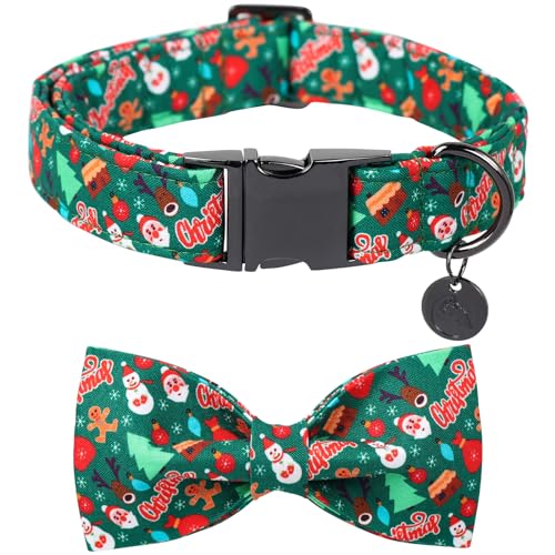 DOGWONG Christmas Holiday Dog Collar with Bowtie, Cute Cotton Green Santa Christmas Dog Bowtie Durable Soft Pet Collars for Medium Large Dogs