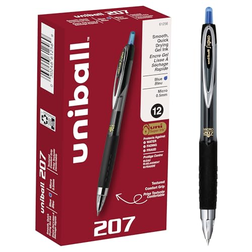 Uni-Ball® 207™ Retractable Fraud Prevention Gel Pens, Micro Point, 0.5 mm, Black Barrels, Blue Ink, Pack Of 12