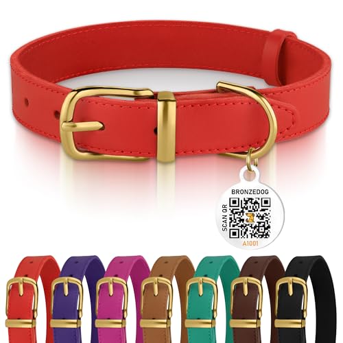 BRONZEDOG Leather Dog Collar with Metal Buckle Durable Basic Pet Collars for Small Medium Large Dogs (13-16 Inch (Pack of 1), Red & Gold Buckle)