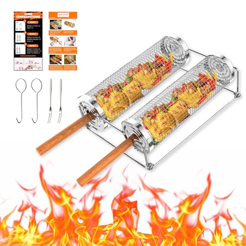 Grill Baskets for Outdoor Grill, Rolling Grill Basket with Removable Wooden Handle & Stand, Stainless Steel Grilling Accessories for Fish, Shrimp, Meat, Vegetables, Fries, Grilling Gifts for Men