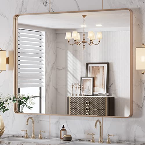 LOAAO 40"X32" Gold Bathroom Mirror, Rounded Rectangle Gold Frame Mirror, Brushed Gold Bathroom Vanity Mirror Wall-Mounted, Anti-Rust, Tempered Glass, Hangs Horizontally or Vertically
