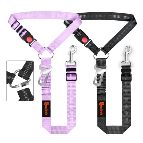 Removable Dog Seat Belt Harness for Car, 3 in 1 Pet Dog Car Seatbelt Leash, Retractable Restraint Secures to Vehicle Headrest & Adjustable Reflective Bungee Dog Seatbelt Tether, Purple and Black
