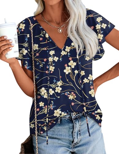 Anydoll Womens 2025 Summer Boho Tops Casual Chiffon Blouse V Neck Short Sleeve Floral Shirt Medium