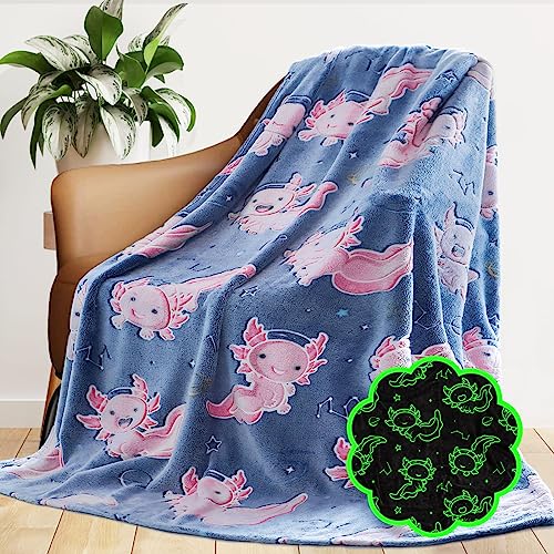 Axolotl Blanket for Kids Glow in The Dark Salamander Blanket Pink Cute Soft Cozy Blue Throw Gifts for Boys Teens Girls Toddlers Birthday