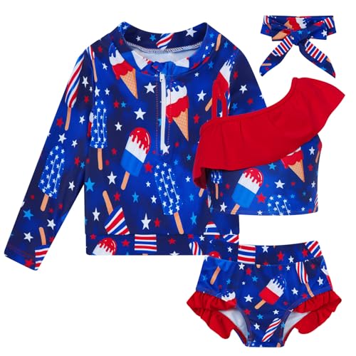 Funnycokid Toddler Girl Patriotic Swimsuit 18-24 Months 4th of July Rash Guard 18 Month Long Sleeve Bathing Suits Ice Cream Swimwear Red Ruffle