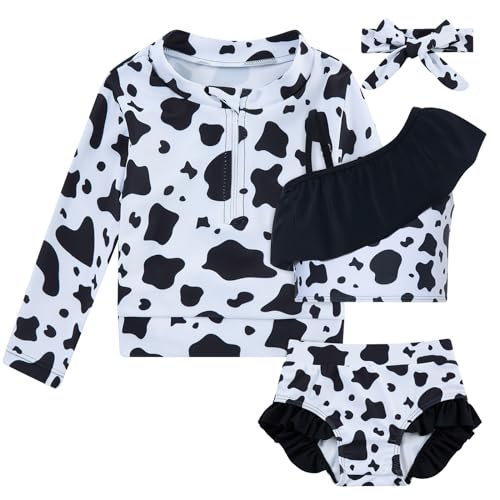Funnycokid Toddler Girls Swimsuit 4T 5T Bathing Suits Rash Guard Bikini Sets 4 Piece Black Ruffle Long Sleeve Cow Swimwear Beach Swimming