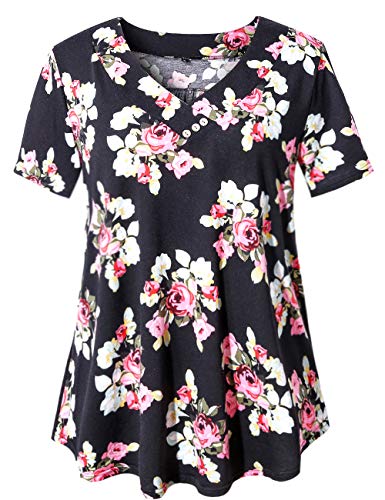 U.Vomade Women's Tops Floral Print Short Sleeve Blouses Summer Tunic Black Flower Large