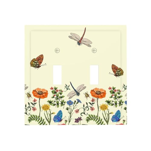 Boho Colorful Dragonfly Floral Decorative 2-Gang Decorator Outlet Light Switch Cover Beige Spring Summer Butterfly Leaf Botanical Flower Double Toggle Electrical Switch Receptacle Face Wall Plate