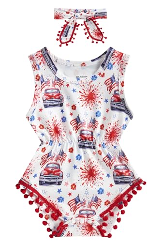 UNICOMIDEA 4th of July Clothes Baby Girl Summer Outfit Flag 0-3 Months Newborn Bodysuit with Headband Cute Infant Car Romper Bodysuit