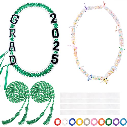 17 Pcs Graduation Ribbon Lei Graduation Candy Lei Kit Class of 2025 with Honor Cord Graduation Gifts Party Supply Women and Men (Green with White)