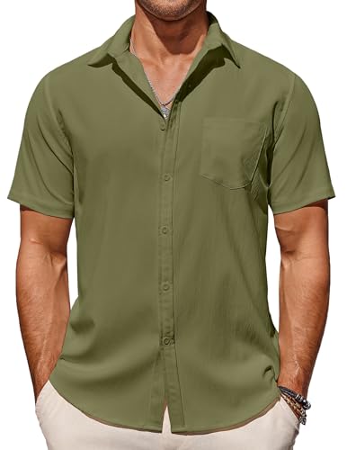 COOFANDY Men's Button Up Short Sleeve Summer Beach Shirt Linen Breathable Stretch Wedding Shirts Casual No Tuck Shirts Army Green