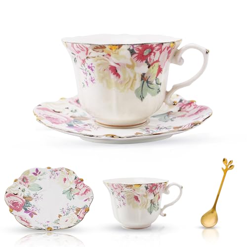 TATSUMI Country Roses Bone China Tea Cup and Saucer Set, 6 Pieces, Vintage Style, For Women and Tea Parties