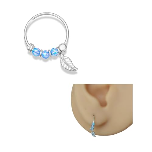 Miya Jewelry Handmade Silver Single 10MM Cartilgae Helix Piercing Hoop Earring with Trio Blue Opal & Tiny Leaf, 925 Sterling Silver Very Small Thin 22Gauge Hoop for women (Silver-Leaf-Blue)