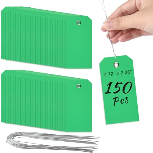 150 Pcs Tags with String Green Waterproof Tags, PLULON 4 3/4" x 2 3/8" Shipping Labels Tags for Labeling Waterproof Hang Tags Bulk Writable Blank Tags Name Price Tag for Inventory Luggage Clothing