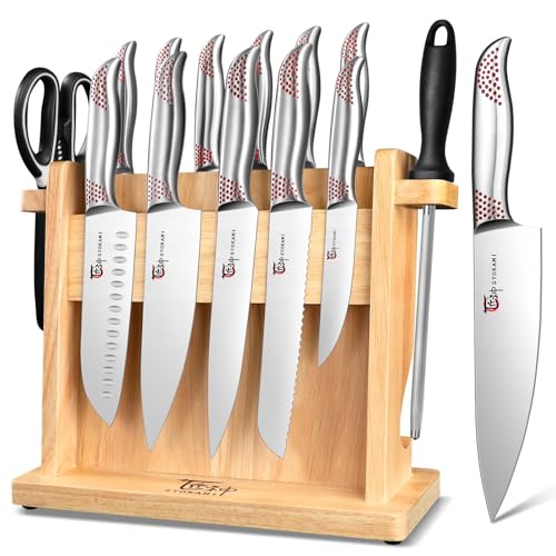 PROFESSIONAL SET: This 22-piece set includes (1) of each of the following: 8-inch chef's knife, 8-inch slicer knife, 8-inch bread knife, 7-inch Santoku knife, 5-1/2 inch utility knife, 3-1/2 inch paring knife and a sharpening steel